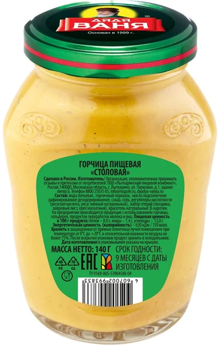Отечественная горчица Дядя Ваня столовая, 140г - это сбалансированная приправа, которая подходит для использования в комбинации с различными блюдами. В отличие от многих товаров подобного типа, данная добавка имеет умеренную остроту и не вызывает сильного дискомфорта во время еды. Вязкая мягкая консистенция помогает равномерно распределить горчицу. В состав продукта входят горчичный порошок, лавровый лист, подсолнечное масло, черный перец и другие ингредиенты. Упаковка в виде банки выглядит по-домашнему, легко открывается, закрывается и позволяет удобно хранить товар.