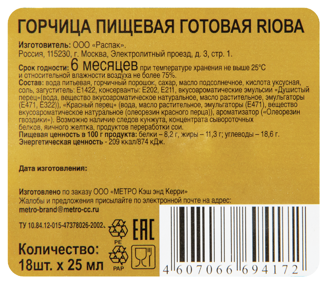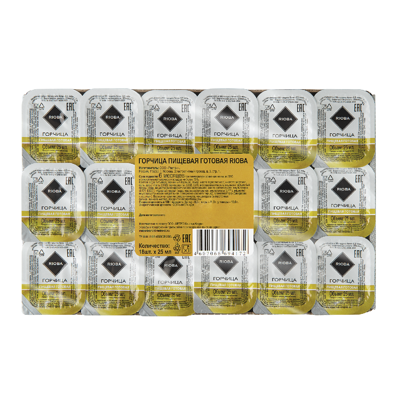 Горчица Rioba, 18х25г добавит нотку пикантности блюдам из мяса, овощей, морепродуктов, рыбы и птицы, а также станет прекрасным вариантом для хот-догов. Продукт также может стать основой для создания изысканных соусов к различным блюдам. Горчица благотворно воздействует на процесс обмена веществ и ускоряет сжигание жиров. Может выступать в роли вспомогательного средства при лечении простудных заболеваний. Продукт является прекрасной профилактикой сердечно-сосудистой системы.