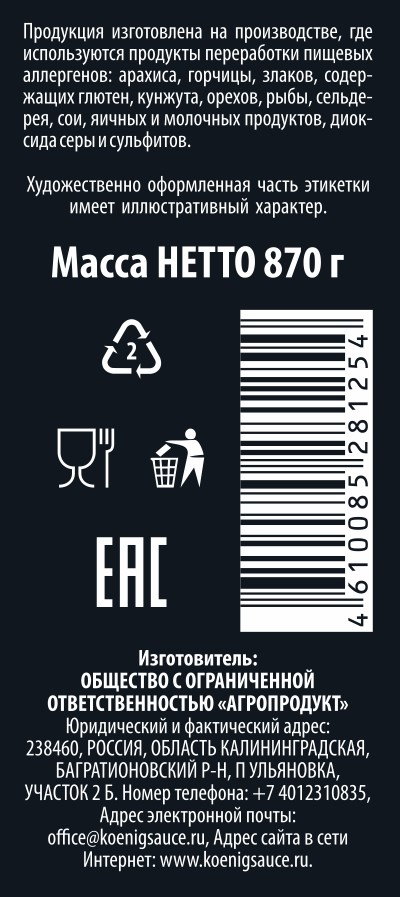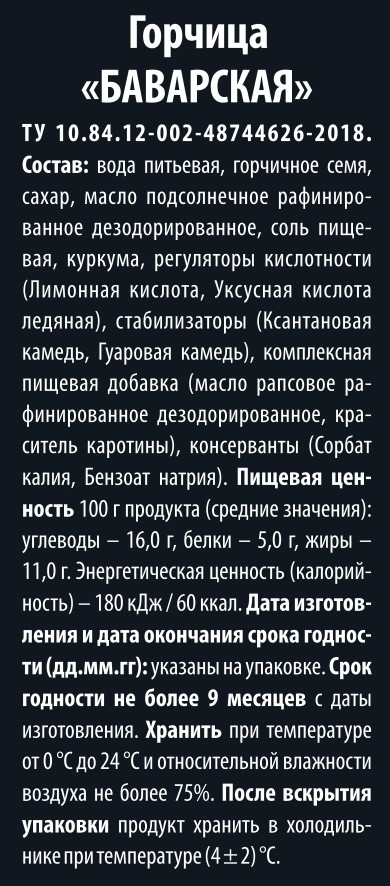 Вода питьевая, горчичное семя, сахар, масло подсолнечное рафинированное дезодорированное, соль пищевая, куркума, регуляторы кислотности (лимонная кислота, уксусная кислота ледяная), стабилизаторы (ксантановая камедь, гуаровая камедь), комплексная пищевая добавка (масло рапсовое рафинированное дезодорированное, краситель каротины), консерванты (сорбат калия, бензоат натрия).