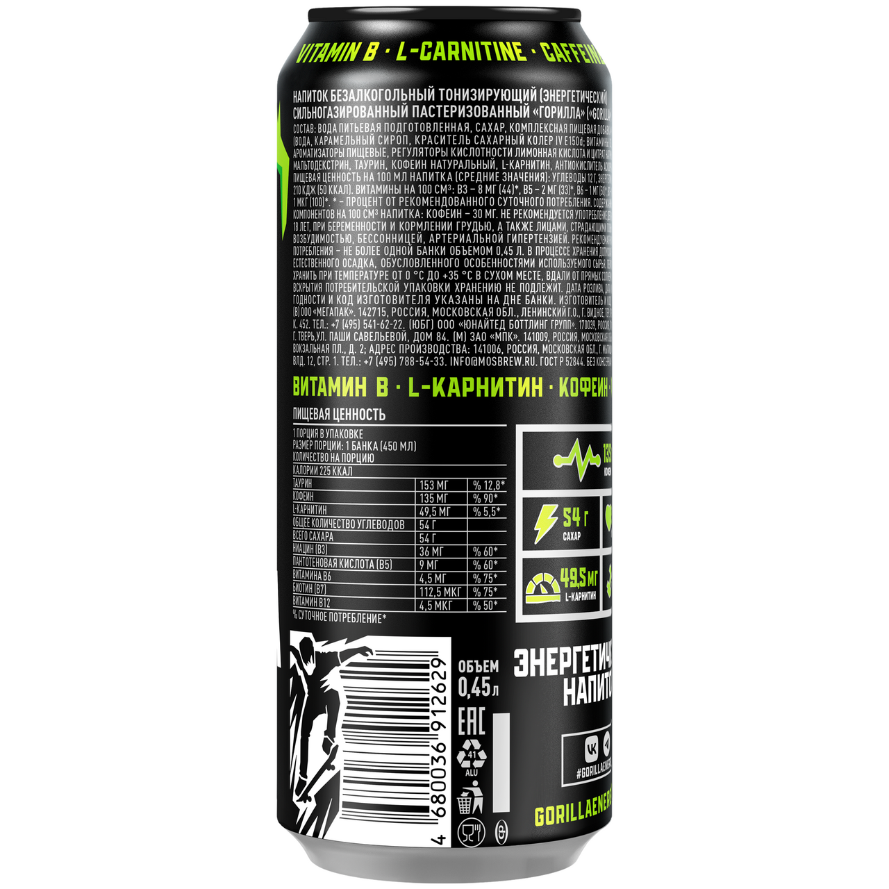 Напиток энергетический Gorilla в железной банке, 0,45 л обладает приятным тонизирующим вкусом и хорошо утоляет жажду. Благодаря присутствию в составе витаминов, женьшеня, таурина, кофеина и других натуральных компонентов он позволяет быстро получить заряд бодрости, восстановить утраченные силы, активизировать физическую и умственную деятельность. Напиток также повышает выносливость, препятствует быстрой утомляемости и улучшает обменные процессы в тканях. Чтобы максимально раскрыть вкусовые и ароматические качества, рекомендуется употреблять его в охлажденном виде. Напиток помещен в компактную железную банку емкостью 450 мл, которую легко открыть, дернув за расположенное сверху металлическое кольцо-ключ.