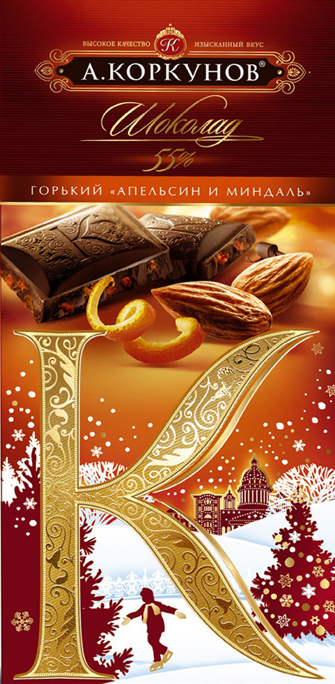 Изысканное сочетание горького шоколада "А. Коркунов" классический 55%, кусочков апельсина и миндаля подарит вам настоящее новогоднее удовольствие. Ограниченная серия - Апельсин Миндаль, самый настоящий новогодний вкус. Настоящий российский шоколад с благородным и изысканным вкусом, который тает во рту. Для производства шоколада "А. Коркунов" используются только отборные какао-бобы, что делает его вкус незабываемым.Высокое качество, натуральные ингредиенты в совокупности с новогодней премиальной упаковкой шоколада А. Коркунов -отличный подарок или комплиментом для Ваших коллег и партнеров