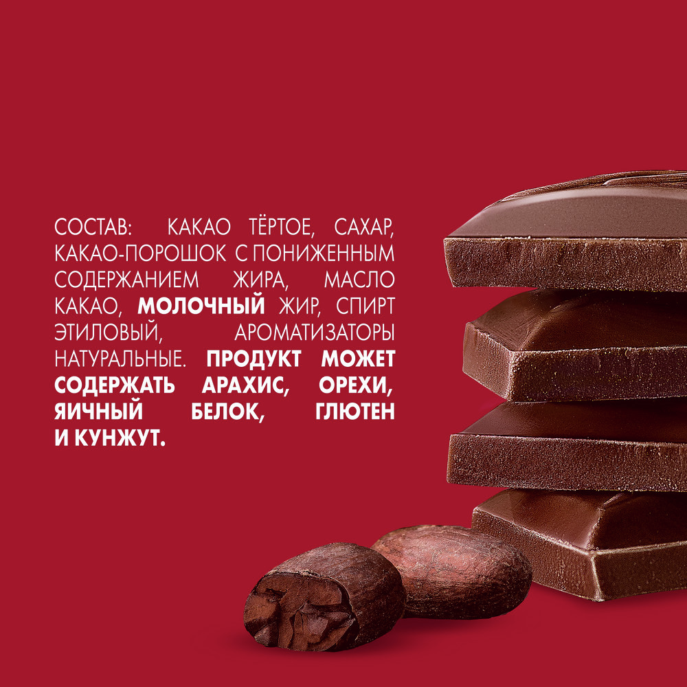 Какао тертое, сахар, какао-порошок с пониженным содержанием жира, масло какао, молочный жир, спирт этиловый, ароматизаторы натуральные. В шоколадной массе: сухой общий остаток какао — 70%.
