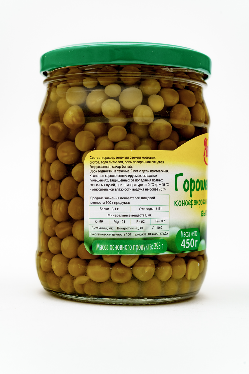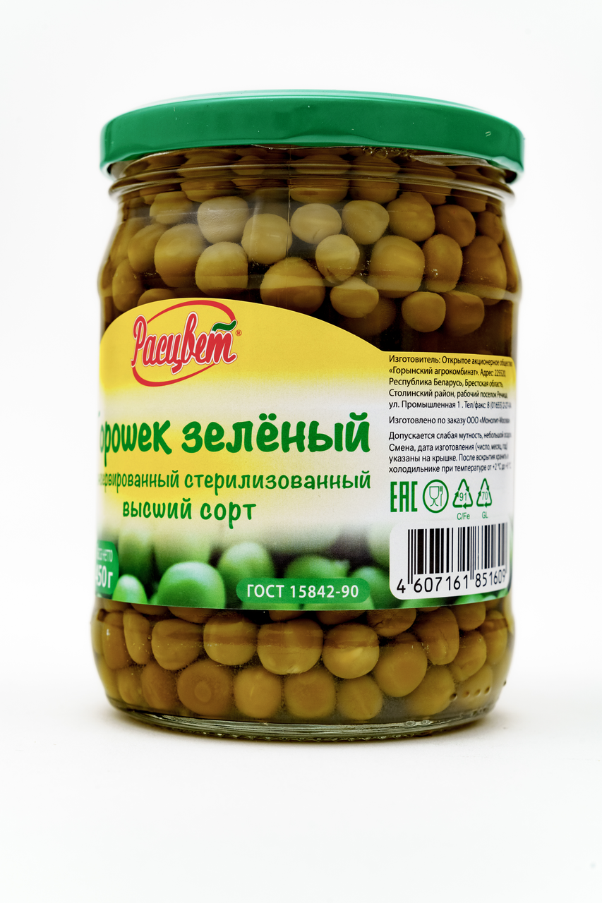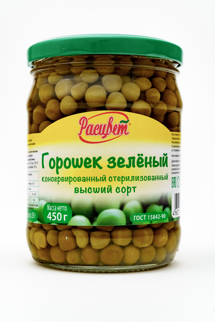 Горошек РАСЦВЕТ зеленый консервированный стерилизованный высшего сорта стекло, 450 г