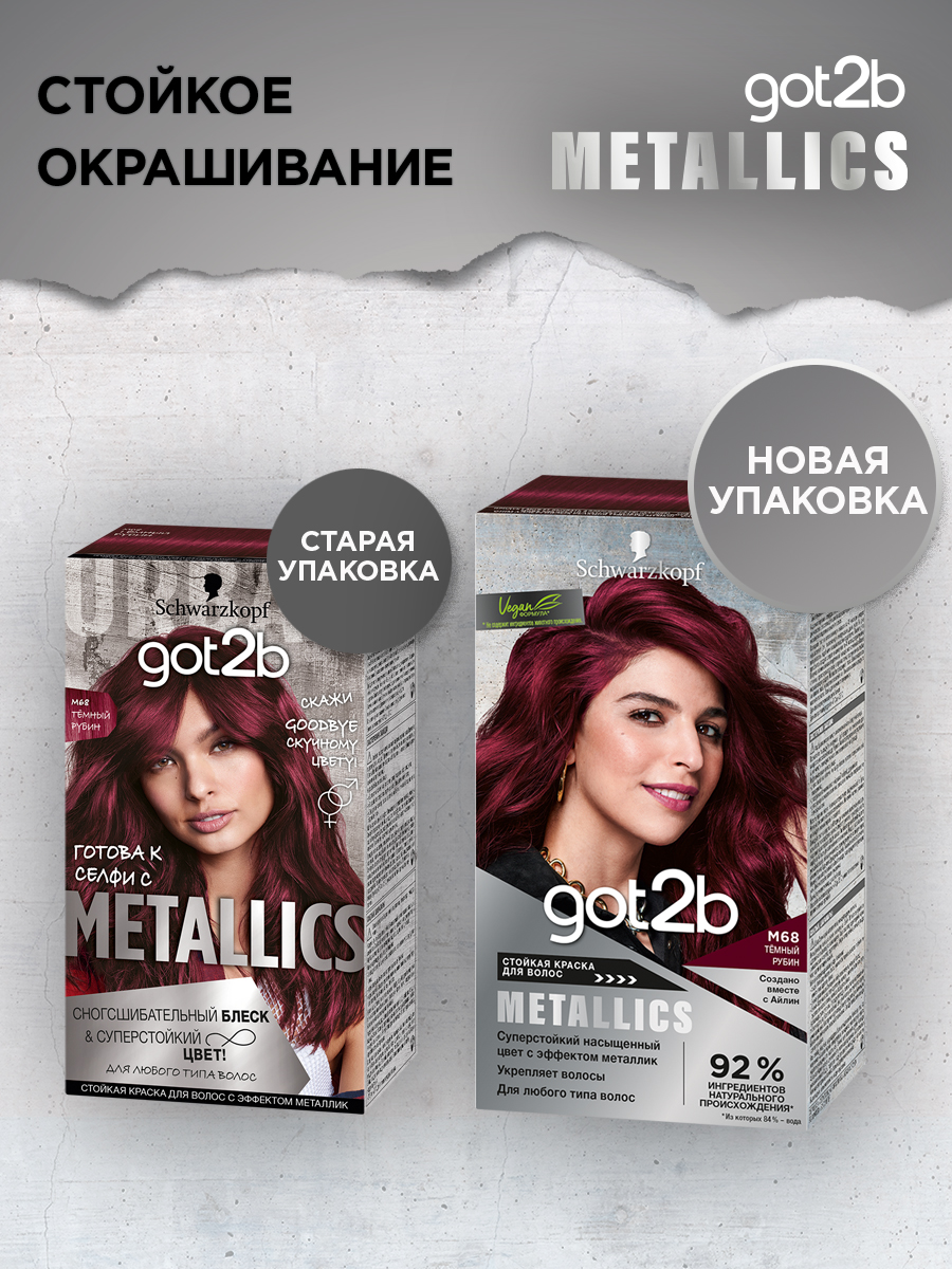 Будь готова к селфи с Краска для волос Got2b Metallics М68 Темный рубин, 142.5мл! Смешай, нанеси, сражай наповал! Оттенки с соблазнительным блеском металлик и защитой от вымывания для стойкого цвета.
