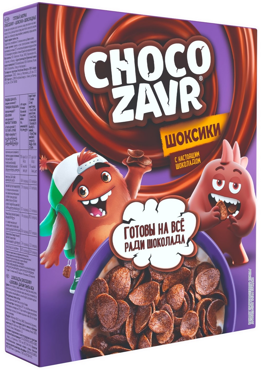 Фигурный готовый завтрак с настоящим шоколадом, без консервантов. Мультизлаковый состав без консервантов и пальмового масла делает этот готовый завтрак невероятно питательным, а тающая начинка - потрясающе вкусным. Подушечки Chocozavr любят и дети, и взрослые, с молоком или просто с чаем.