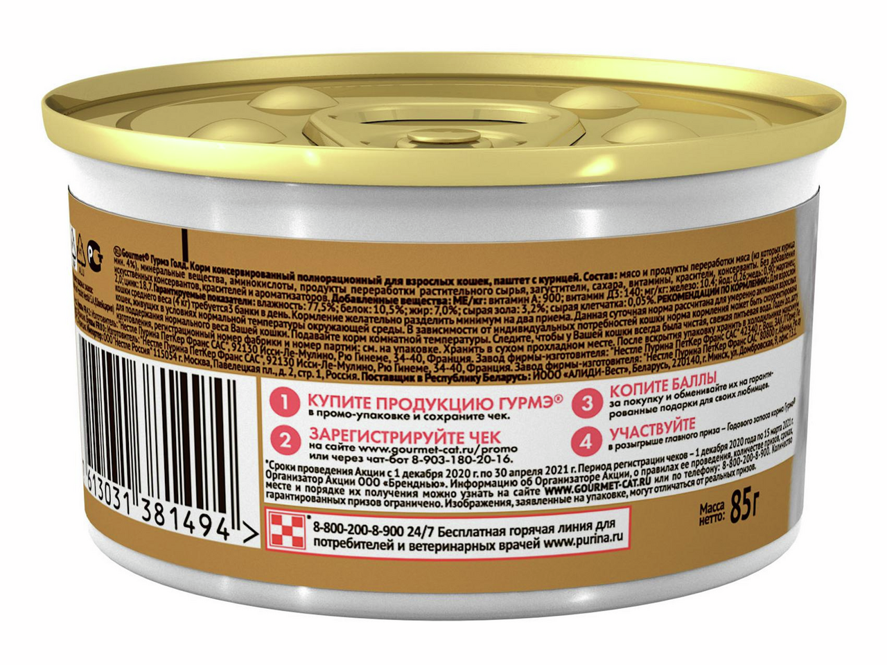 Gourmet Влажный корм для кошек с курицей Gold 85 г х 12 шт изготовлен на основе отборных натуральных ингредиентов без добавления искусственных красителей, ароматизаторов, консервантов и других синтетических компонентов. Он отличается нежной, сочной текстурой с консистенцией аппетитного паштета и предназначен для взрослых домашних питомцев. Продукт богат легко усваивающимся белком, содержит витамины, минеральные элементы и противодействующие агрессивному воздействию свободных радикалов антиоксиданты. Корм хорошо насыщает, заряжает животное активностью, силой и энергией, способствует нормализации веса и не вызывает проблем с пищеварением. Он улучшает состояние кожи, делает шерсть красивой, густой и блестящий, снижает риск ра��вития различных заболеваний, повышает иммунитет. Продукт весом 85 грамм помещен в компактные жестяные баночки. Такая упаковка исключает контакт с кислородом, обеспечивает полную герметичность, надежно сохраняет отменные вкусовые качества и свежесть корма даже без холодильника в течение всего срока годности. Благодаря помещенному на крышку ключу открыть баночку можно без использования специальных инструментов, поэтому ее легко брать с собой для кормления животного за пределами дома: на даче, в гостях, во время долгой поездки. Рекомендуемая суточная норма составляет четыре банки продукта в день для одного взрослого животного. Это количество корма необходимо разделить на два приема: утренний и вечерний. Приобрести Gourmet влажный корм для кошек с курицей Gold 85 г х 12 шт можно в торговом центре METRO. Состав: мясо и субпродукты животного происхождения (мин. 4% курицы, 4% сердца, 4% печени), злаки, минеральные вещества, сахара, витамины. витамин A: 1110 МЕ/кг, витамин D3: 140 МЕ/кг, витамин E (альфа-токоферол): 10 мг/кг. Уровень содержания витаминов гарантируется в течение всего срока годности. Питательная ценность: влажность 81,5%, сырой белок 7,5%, сырой жир 3,7%, зола 1,3%, сырая клетчатка 0,5%.