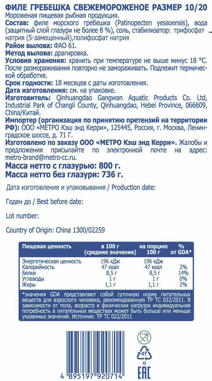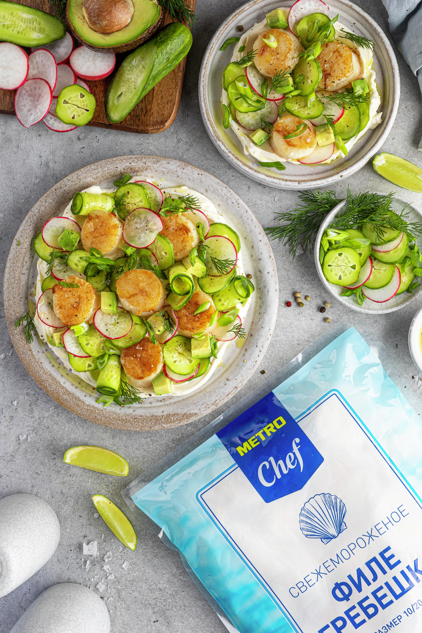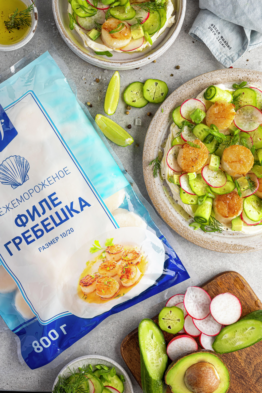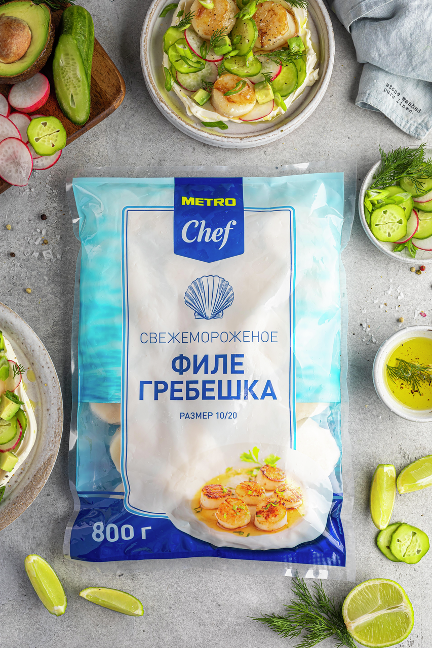 Филе гребешка - изысканный морской деликатес, который разнообразит ваше привычное меню и не потребует много времени на приготовление. Нежное, чуть сладковатое мясо морских гребешков, являющееся изысканным и дорогим деликатесом, поступает в замороженном и соленом виде. В пищу идут плотный мускул-замыкатель и икряной мешочек, из которых готовят как самостоятельные блюда, так и сочетают с разнообразными продуктами. Приготовление морского гребешка не требует особых познаний в кулинарии и, по большому счету, ограничивается только фантазией повара. Особенно богата рецептами приготовления гребешков французская кухня: многочисленные салаты, заливное, голубцы, и даже котлеты и начинка для пирожков - лишь неполный перечень кулинарных шедевров. Среди гурманов очень популярны сырые гребешки, политые оливковым маслом и лимонным соком. Мясо гребешков нежное, слегка сладковатого вкуса. Морские гребешки используют для приготовления различных блюд. Их также можно употреблять в пищу и сырыми. Гребешки используют для приготовления вторых блюд, а также салатов. Выпуская продукцию под собственными торговыми марками METRO, мы стремимся максимально удовлетворить потребности наших клиентов. Наша цель - понять, какой ассортимент для них актуален и предложить его по привлекательной цене. Мы также внимательно изучаем тенденции рынка, чтобы быть в курсе последних трендов и своевременно предлагать решения под собственными торговыми марками в соответствии с ними.