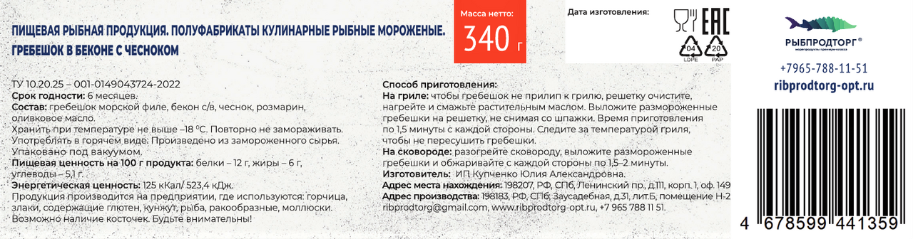 Гребешок Рыбпродторг в беконе с чесноком замороженный, 340г