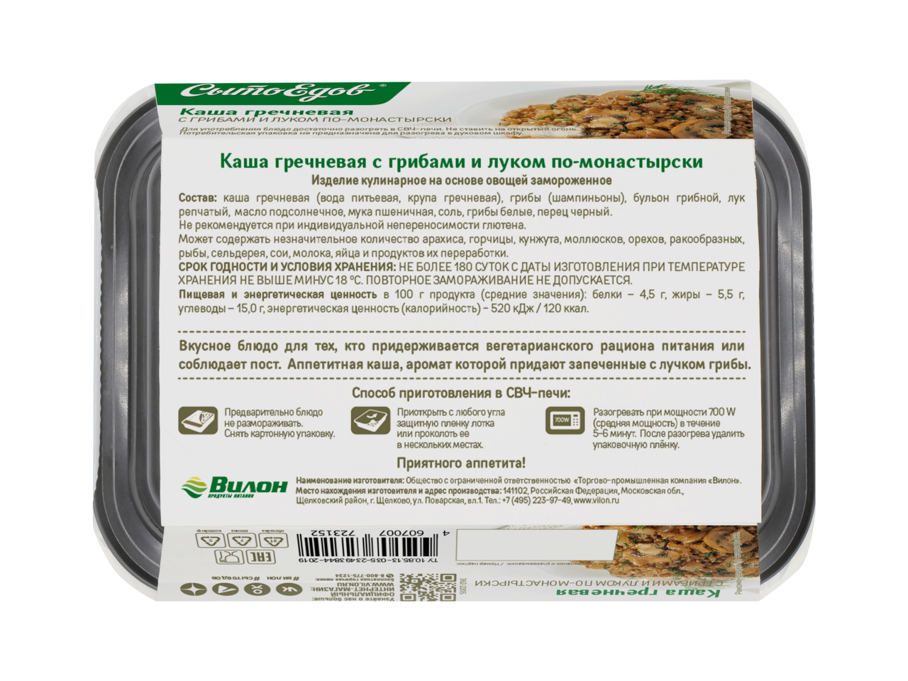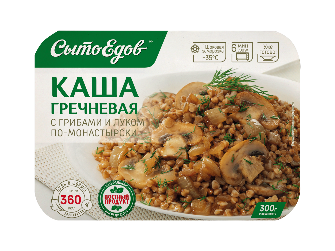 Готовое блюдо СЫТОЕДОВ каша гречневая с грибами и луком - отличный выбор для торговых точек в период поста. Продукт пользуется высоким спросом и популярностью благодаря своему отменному вкусу, натуральности и возможности быстрого приготовления. Среди покупателей не только постящиеся, но и вегетарианцы. В составе нет консервантов, красителей, а также ГМО компонентов. Производитель позволяет экономить время на прием пищи, при этом получать все необходимые компоненты для бодрости духа, крепкого здоровья и силы. Готовое блюдо СЫТОЕДОВ каша гречневая с грибами и луком, 300г всегда в наличии в торговом центре METRO по привлекательной цене. Бренд: Сытоедов. Производитель: ООО ТПК ВИЛОН, Россия. Состав: грибы (шампиньоны), крупа гречневая, бульон грибной, лук репчатый, масло растительное, сливки растительные, соль, мука пшеничная высший сорт, перец черный молотый. Пищевая ценность на 100г: белки - 6г, жиры - 4,5г, углеводы - 25,2г. Энергетическая ценность: 168 ккал. Способ приготовления: снять картонную упаковку. Приоткрыть с любого угла защитную пленку на 1-2 см или проколоть в нескольких местах. Поместить лоток в СВЧ-печь или духовой шкаф. В СВЧ-печи разогревать при мощности 700W в течение 5-7 минут. В духовом шкафу разогревать при температуре 130'C-150'C в течение 30 минут. Аккуратно удалить защитную пленку лотка. Осторожно, горячо! Повторное замораживание не допускается. Не ставить на открытый огонь. Срок годности и условия хранения: 180 суток при t хранения не выше -18'C. Стандарт: ТУ 9165-007-23493844-07.