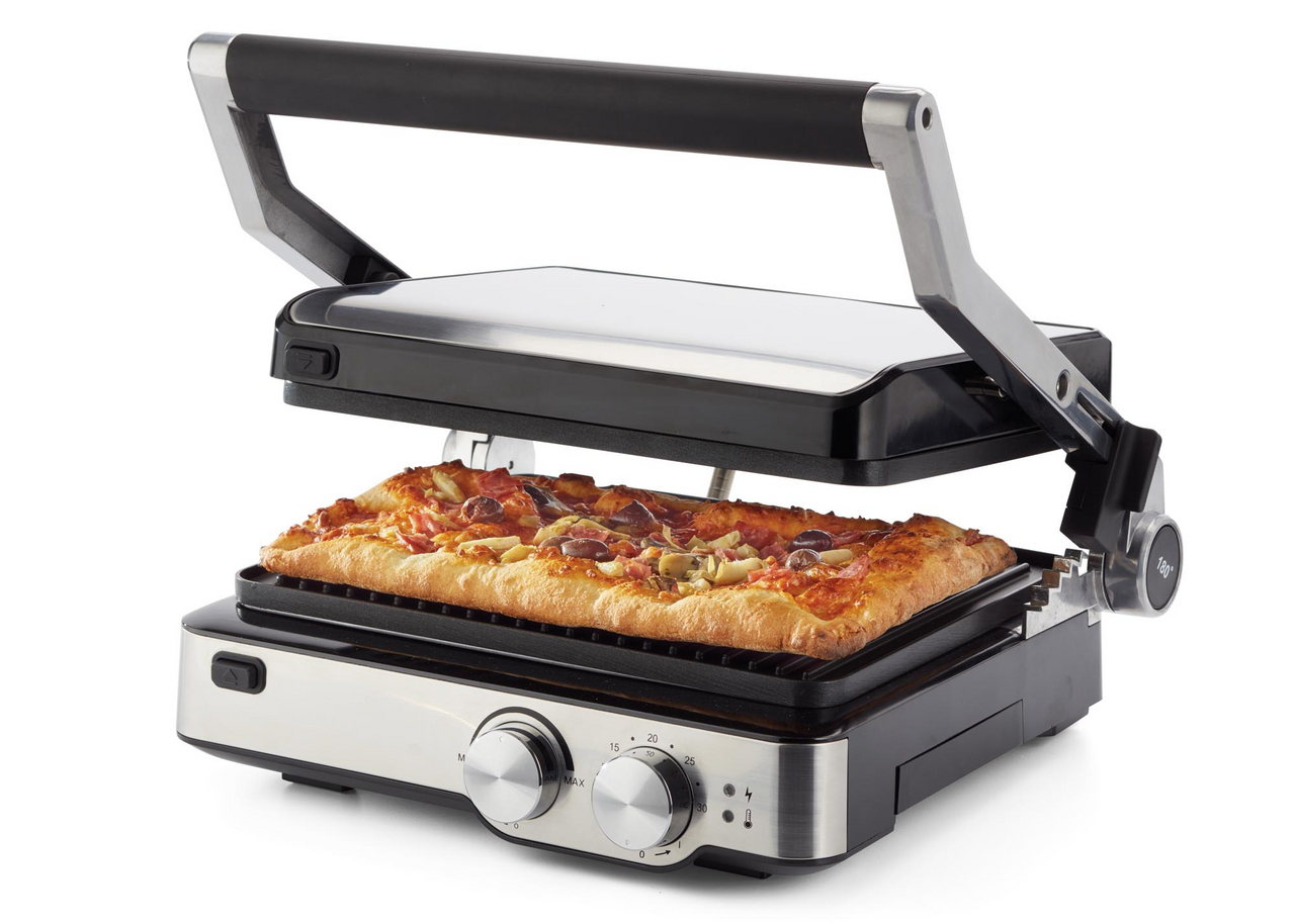 Электрогриль настольный Ariete 1918 Grill&Taste можно использовать в домашних условиях или в небольших кафе, барах и других заведениях общественного питания. Готовить на гриле легко и удобно. Ручка прибора не нагревается, что делает его безопасным. Прибор автоматически отключается после окончания программы, что исключает подгорание продуктов. Эта модель компактная, с привлекательным дизайном. Она поможет приготовить вкусные стейки, быстро пожарить сосиски и овощи, сделать любимые бургеры и т. д. Подготовленные продукты просто выкладываются на пластины. После этого включается нужный температурный режим. Нагревающие элементы расположены под верхней и нижней пластиной. Это позволяет продуктам прожариваться равномерно. Для приготовления не требуется масло. Благодаря антипригарному покрытию блюда не пригорают. Излишки жира стекают по специальным желобкам в поддоны. Все детали легко очищаются после окончания работы. Съемные пластины можно мыть под проточной водой (горячей или холодной, с моющими средствами или без них). Готовить можно под прессом (им служит крышка прибора) или открытым способом. Крышку можно установить в нужном положении (есть пять уровней наклона). Мощности электрогриля достаточно, чтобы любой продукт приготовился быстро. Габариты рабочей поверхности позволяют жарить несколько порций одновременно.