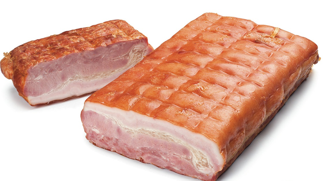 Грудинка свиная, вода питьевая, соевый белок, декстроза, загустители (Е407, Е415), пшеничная клетчатка, стабилизаторы (Е450i, Е452i), усилитель вкуса и аромата Е621, антиокислители (Е301, Е330), ароматизаторы, смесь посолочно-нитритная (соль, фиксатор окраски Е250), соль, белок животный (свиной), регуляторы кислотности (Е270, Е262i), экстракты (душистый перец, розмарин, ягоды), краситель Е120.