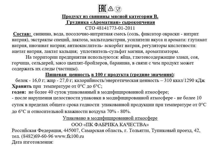 Грудинка Фабрика Качества Ароматная сырокопченая хорошо сочетается с хлебобулочными изделиями. Это отличный выбор для легкого перекуса в течение дня. Хранить при температуре от 0 до +6 градусов при относительной влажности воздуха не более 75%. Продукт с плотной консистенцией имеет яркий и насыщенный вкус и аромат, в котором ощущаются пряные нотки. Основным ингредиентом является свинина – мясо, которое является кладезю витаминов и минералов. В нем есть такие полезные для организма вещества, как калий, кальций, магний, железо, фосфор и некоторые другие. Благодаря этому сырокопченая грудинка – довольно ценный пищевой продукт. Пряности, входящие в составе, придает продукту яркий вкус с особыми пикантными нотками.