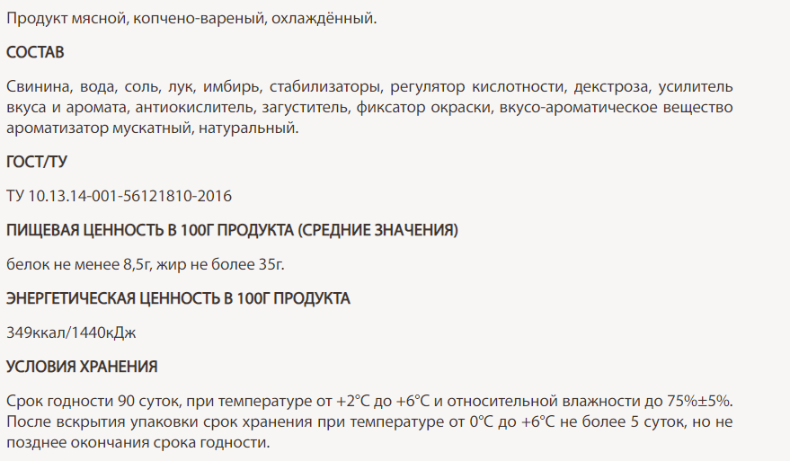 Свинина, вода, соль, сухой животный белок, специи (лук, имбирь), стабилизаторы, усилитель вкуса и аромата, антиокислитель, загуститель, ароматизаторы, экстракт лука, регуляторы кислотности, фиксатор окраски, краситель.