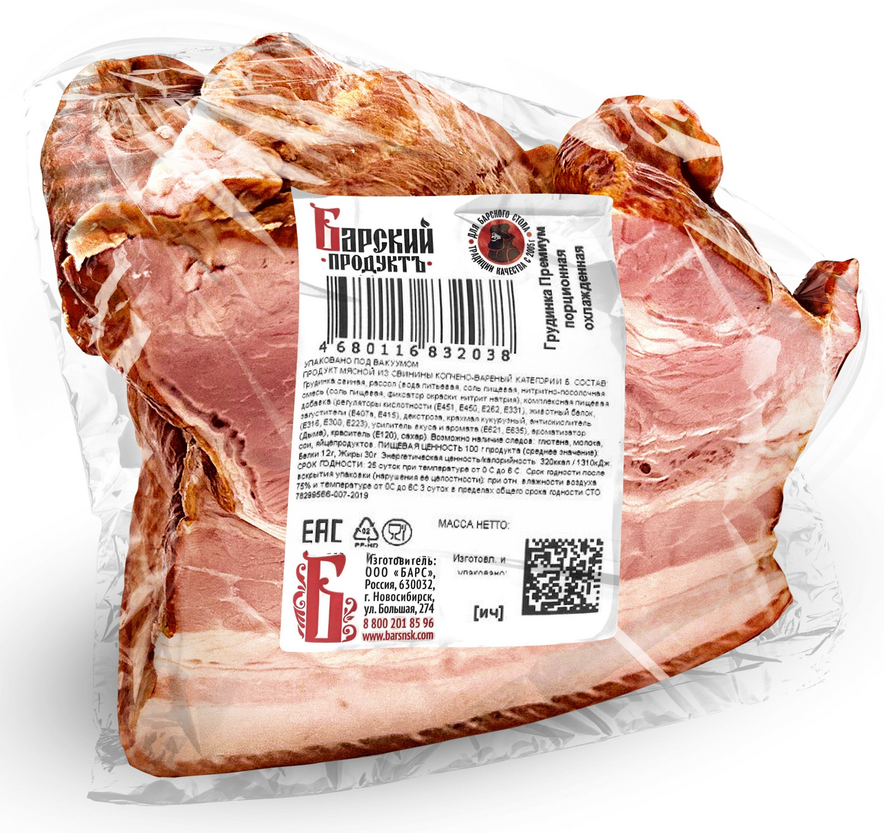 Грудинка свиная Барский продукт Премиум копчено-вареная, ~350г