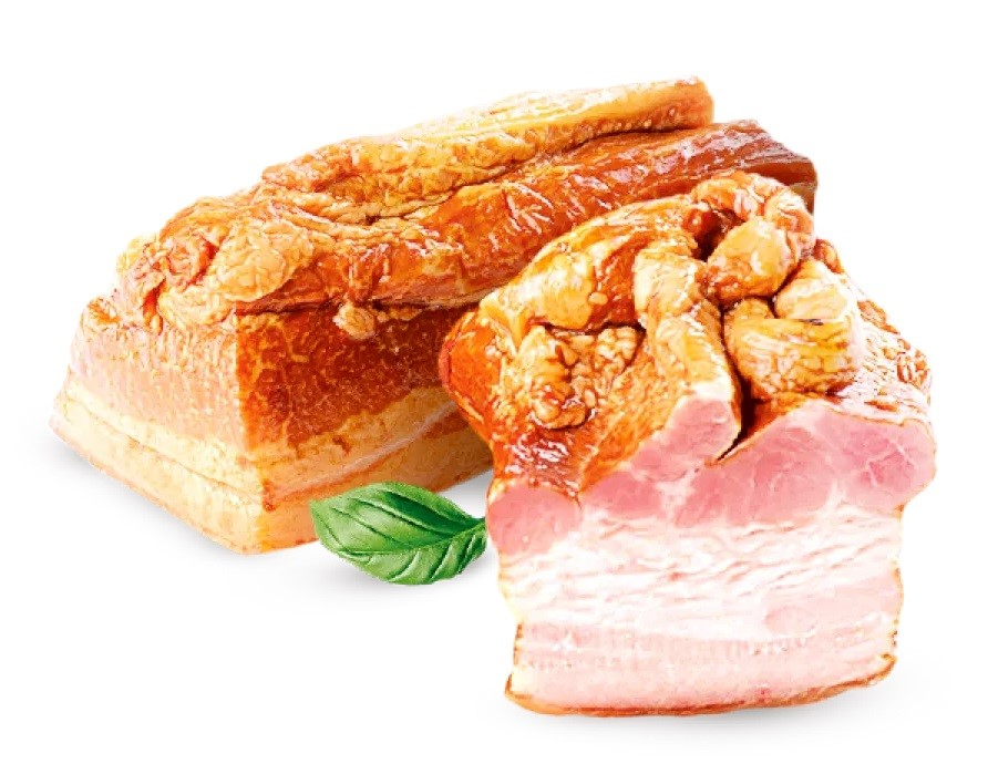 Имеет исключительно нежный вкус и аромат. Сочная мясная грудинка с тонкими прослойками шпика – идеальная холодная закуска к вашему столу.
