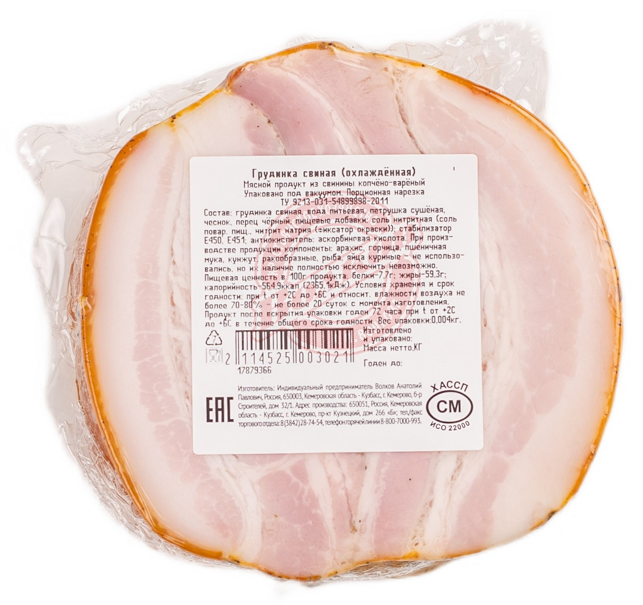 Грудинка свиная, вода питьевая, петрушка сушёная, чеснок, перец чёрный, пищевые добавки: соль нитритная соль поваренная пищевая, нитрит натрия фиксатор окраски, стабилизатор Е450, Е451, антиокислитель: аскорбиновая кислота.