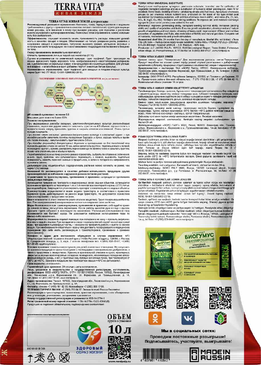 Полностью готовый питательный грунт применяется для выращивания рассады томатов, перцев и баклажанов. Улучшает всхожесть семян, приживаемость рассады, повышает урожайность и качество овощей и плодов; Обеспечивает ускорение роста, развития и созревания овощей и корнеплодов, получение высокого урожая. Улучшает вкусовые и питательные свойства продукции. Восстанавливает плодородие и естественный биоценоз почв.