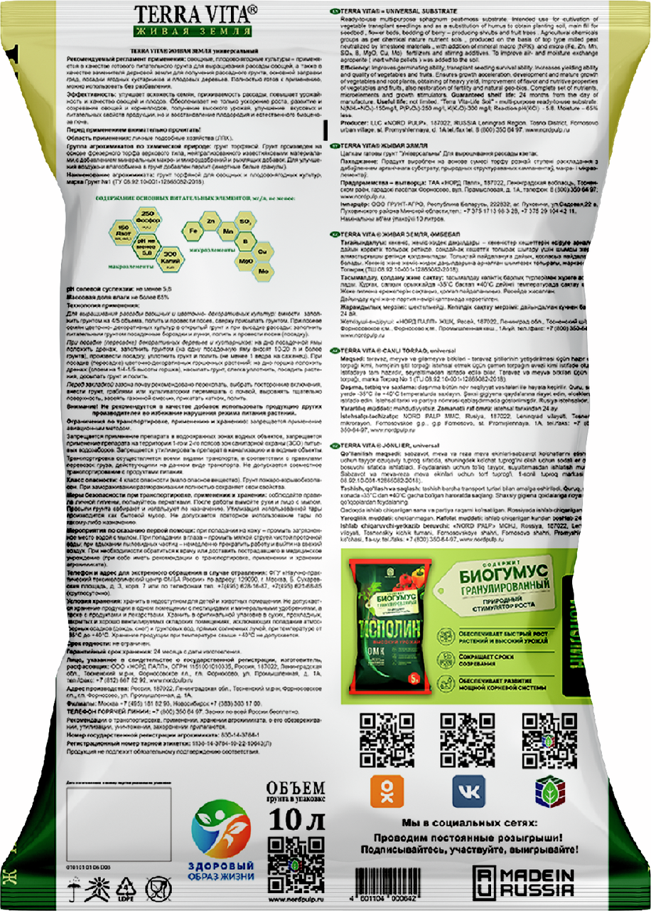 Является полностью готовым питательным торфяным грунтом, специально разработанным для выращивания всех видов овощных, ягодных, зеленных культур, цветов и рассады. Этот грунт производится в России и отличается своими уникальными характеристиками и преимуществами.