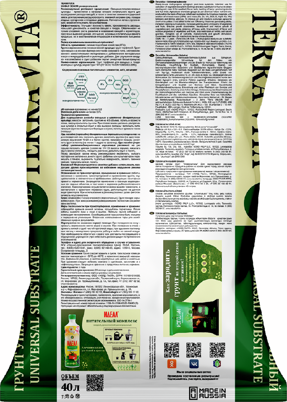 Является полностью готовым питательным торфяным грунтом, специально разработанным для выращивания всех видов овощных, ягодных, зеленных культур, цветов и рассады. Этот грунт производится в России и отличается своими уникальными характеристиками и преимуществами.