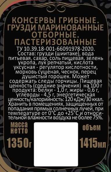 Грузди (шиитаке), вода, соль, сахар, регулятор кислотности - уксусная кислота, зелень укропа, семена горчицы, лук, морковь, душистый перец, чеснок и другие специи и пряности.