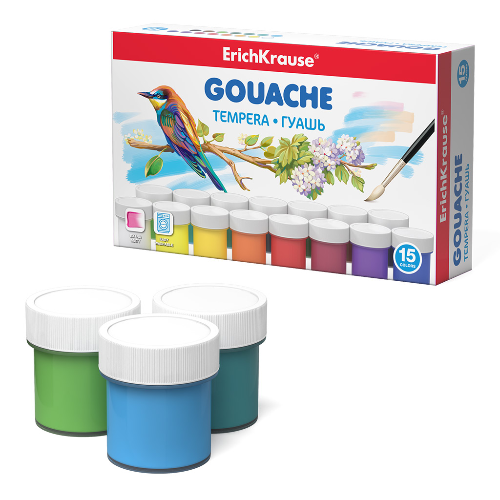 Гуашь отличает высокая кроющая способность краски. Цвета насыщенные, глубокие, отлично перекрываются и образуют экстра матовую бархатистую поверхность по мере высыхания краски. При этом сохраняется яркость и насыщенность тона, краски ложатся ровно, не осыпаются. Хорошо разводится и размывается водой, легко набирается на кисть