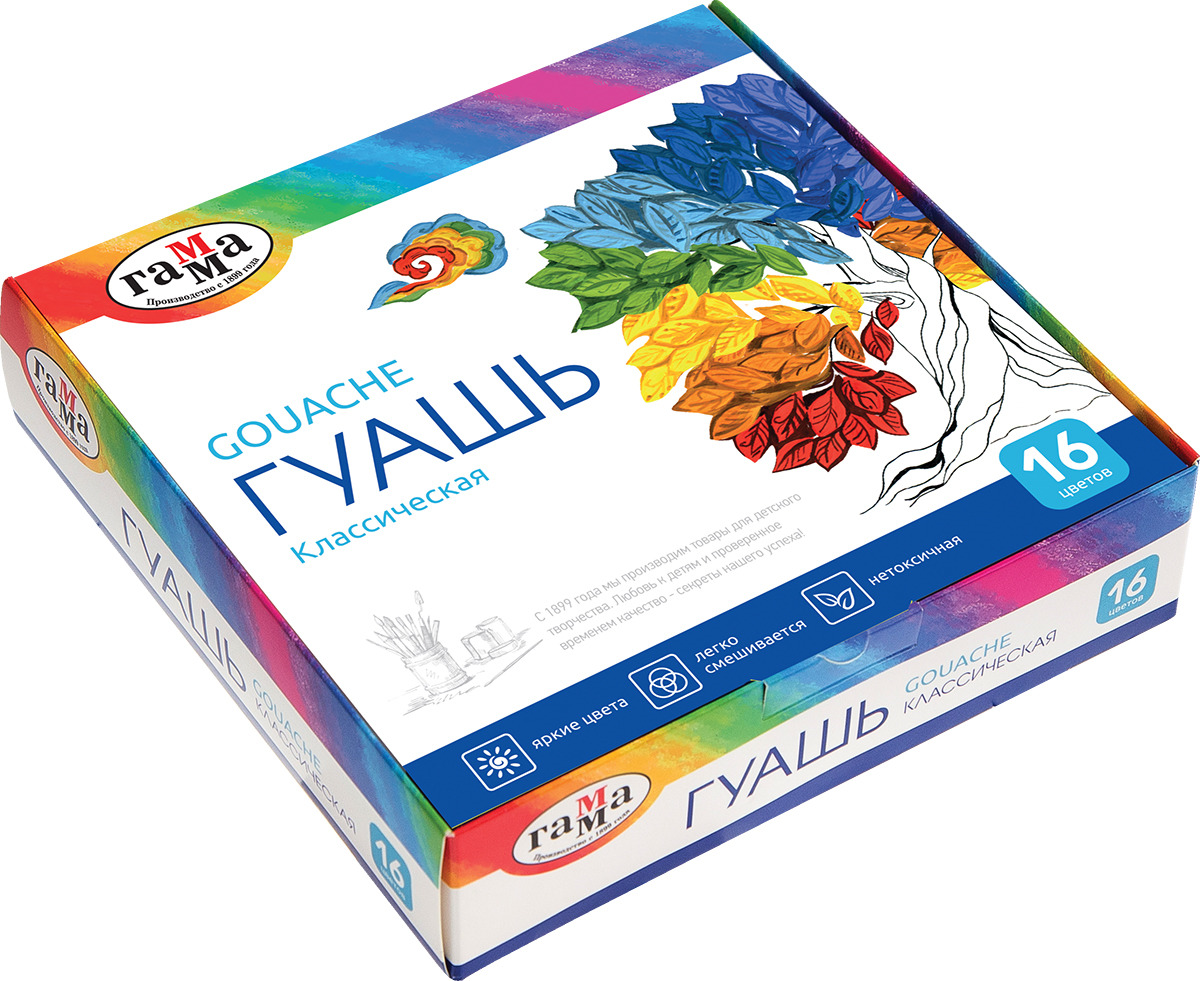 Гуашь ГАММА Классика 16 цветов, 20 мл предназначены для возрастной категории от 7 лет. Благодаря оптимальному количеству цветов и оттенков рисунки вашего ребенка будут наполнены неожиданными переходами, яркими тонами и радостью. Краски вложены к прочную картонную упаковку с выдвижным внутренним отсеком, поэтому станут отличным дополнением к комплекту канцтоваров для творчества в детский сад, школу, изостудию. Гуашь известна человечеству более 2 веков, ее подарили миру французы. Основа краски – белила и пигменты, все вещества абсолютно безопасны для здоровья и экологически чистые. Гуашь по составу гораздо гуще, нежели акварель, хорошо разводится водой и смешивается. Ложится на бумагу плотным, густым слоем, после высыхания образует бархатистую, матовую, немного белесую поверхность, не осыпается и не тускнеет со временем.