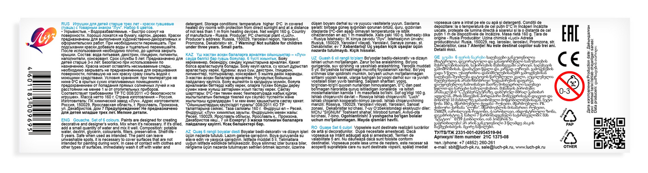 Предназначена для детского творчества, выполнения художественно-декоративных, оформительских работ. Краски изготовлены на основе натуральных компонентов и высококачественных пигментов.