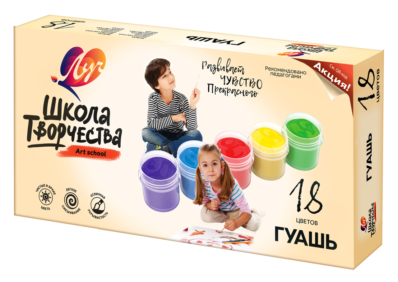 Гуашь Школа творчества изготовлена по улучшенной рецептуре. Благодаря этому цвета краски, не теряя своей яркости и красоты, стали максимально подготовлены для быстрого рисования. Краску не нужно предварительно сильно разбеливать и тратить при этом много белил. Благодаря меньшему расходованию белил из набора, цвета красок теперь будут заканчиваться равномерно, что позволит использовать набор более рационально. При высыхании краска не выцветает, приобретает бархатистую поверхность, имеет отличную укрывистость. Гуашь легко смывается с рук и одежды. Не имеет неприятного запаха. Абсолютно безопасна для детского творчества.