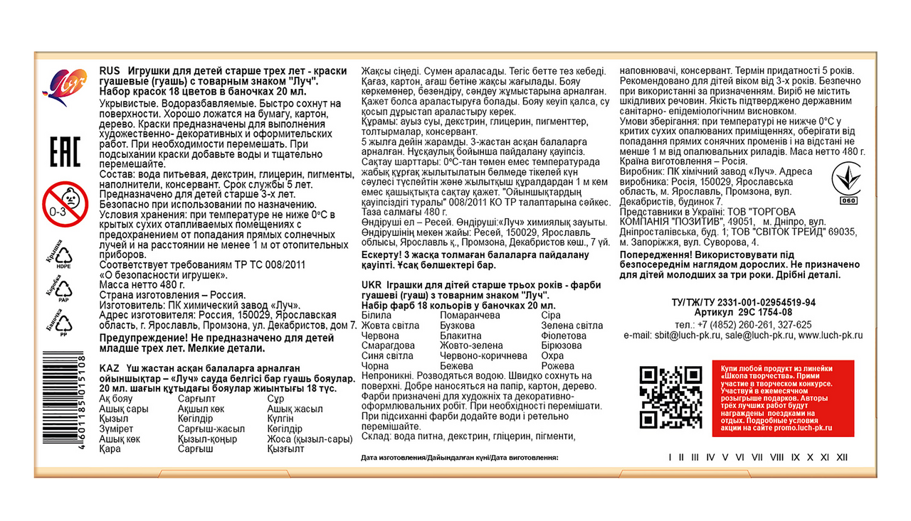 - Комплектация Гуашь 18 цветов - 1 шт.