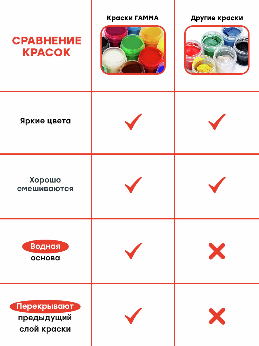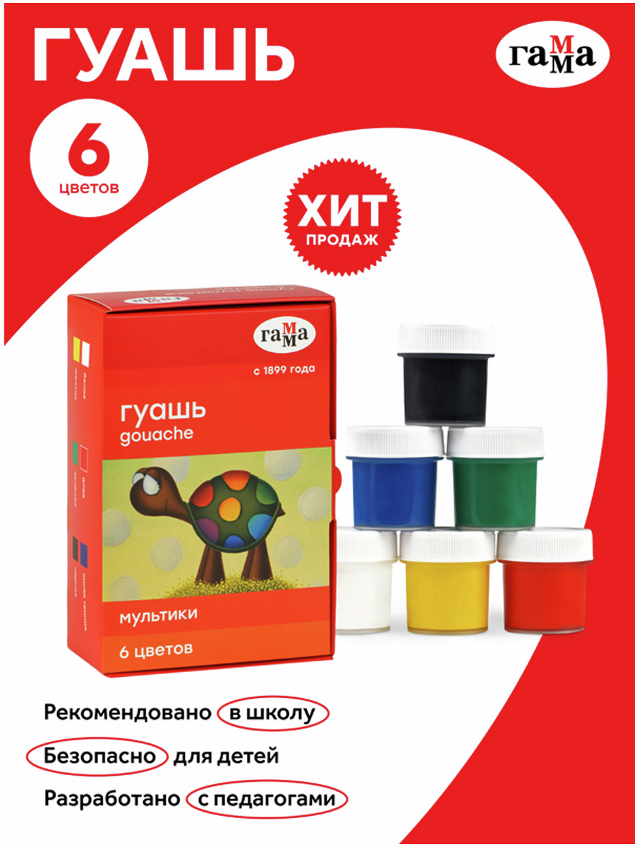 Гуашь разработана совместно с педагогами специально для детей школьного возраста от 6 до 9 лет. Краски отличаются высокой плотностью и укрывистостью, легко наносятся на бумагу, картон или грунтованный холст. Яркие цвета прекрасно смешиваются между собой. Ребенок сможет легко открыть баночки с винтовыми крышками без помощи взрослых. Краски хорошо ложатся на бумагу и обладают высокой укрывистостью. Краски Гамма изготовлены на основе натуральных компонентов и высококачественных пигментов. Легко смываются с рук и отстирываются с одежды.