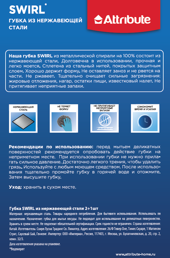 Губка Attribute Swirl из нержавеющей стали, 2+1шт