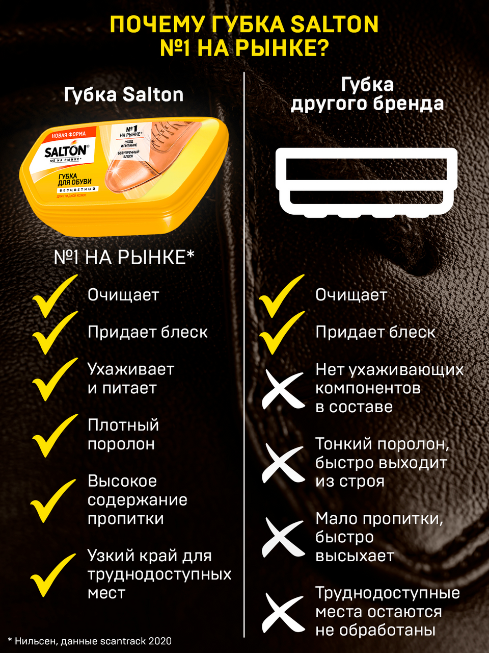 Если Вы хотите быстро почистить Ваши кожаные ботинки и придать им блеск, то без губки для обуви Вам не обойтись. А чтобы быть уверенным, что губка не навредит Вашей обуви и не высохнет после нескольких применений, выбирайте изделия только из качественных материалов, такие как губка Salton. Губка для обуви Salton выполнена из упругого и высокого поролона, что не позволяет пластиковым краям корпуса царапать поверхность обуви. Корпус губки из крепкого полистирола плотно прилегает к поролону и надежно смыкается при закрывании, что не дает пропитке быстро высохнуть и увеличивает срок использования изделия. Благодаря содержанию норкового масла и натурального воска ланолина, пропитка этого средства для обуви увлажняет, смягчает и защищает от загрязнений кожаную поверхность обуви. Губка для обуви бесцветная от Salton быстро очищает и придает блеск обуви из кожи любого цвета. Позаботьтесь о чистоте и защите Вашей любимой обуви вместе с Salton.