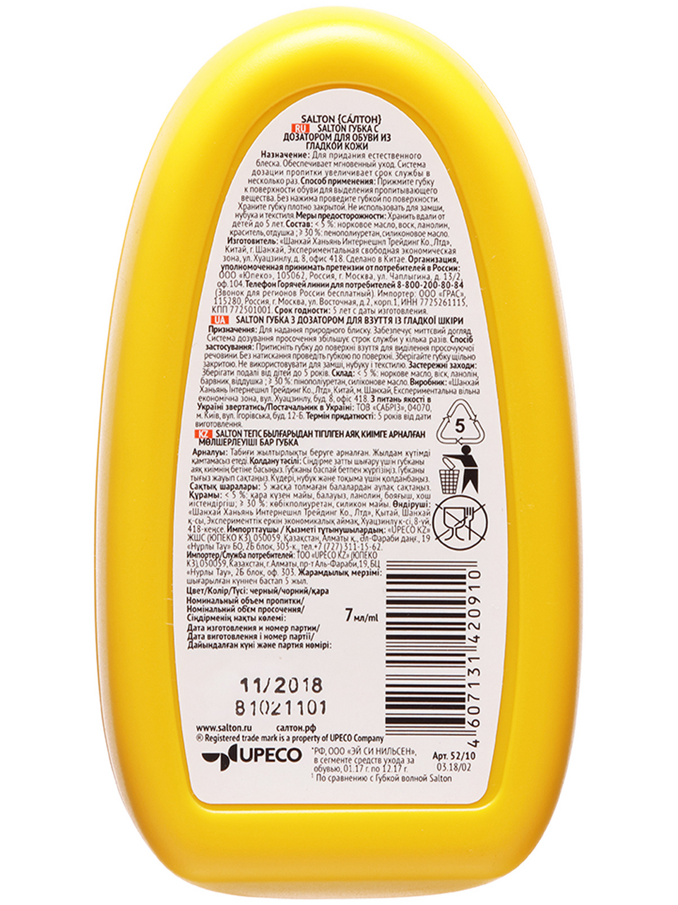 Для очищения обуви от пыли и легких загрязнений. Придает блеск. Дополнительный контейнер с силиконовой пропиткой, в который встроена система ее дозации, увеличивает срок службы губки с дозатором до 2х раз дольше по сравнению с обычной губкой. Двухслойный поролон делает губку с дозатором более упругой и не позволяет пластиковым краям касаться поверхности обуви.