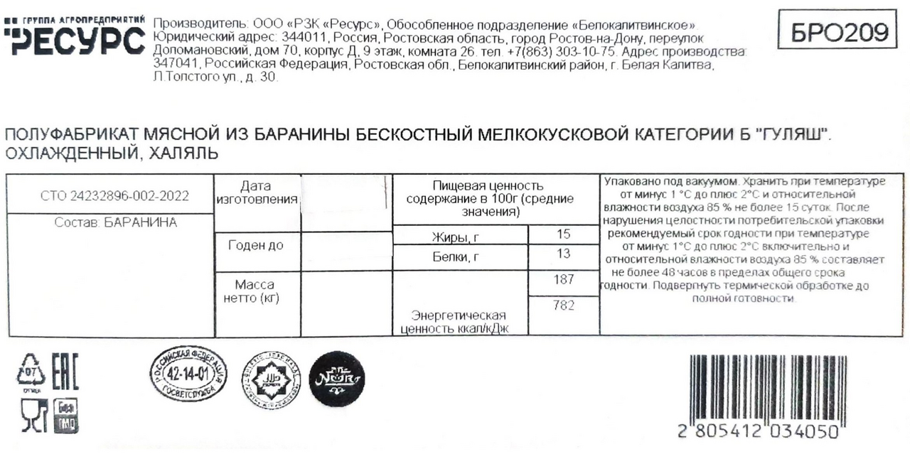 Гуляш из мяса баранины An-Noor охлажденный, ~1кг