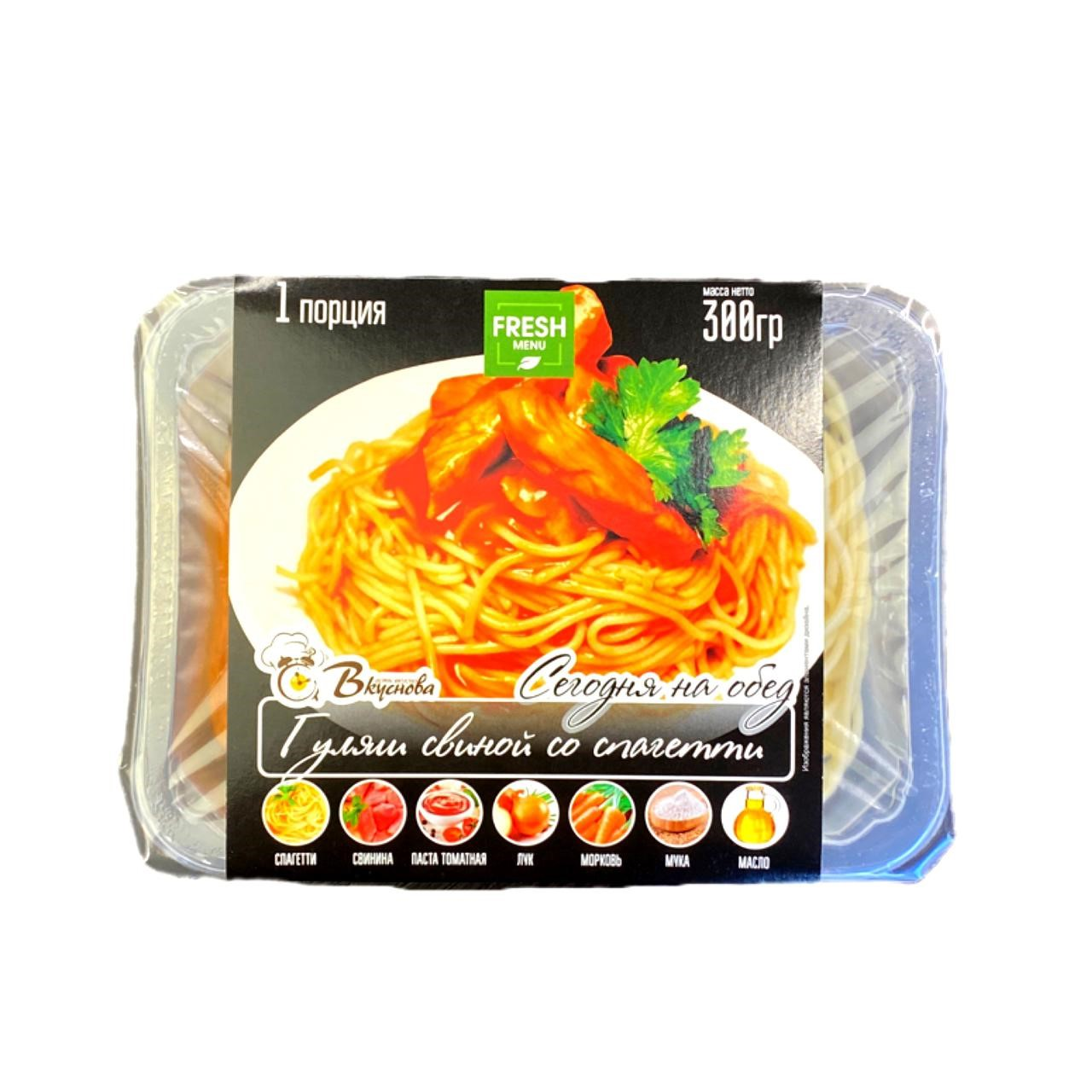 Комплексный обед Гуляш из свинины + спагетти. Состав: спагетти отварные (200 г): макаронные изделия (мука пшеничная, вода), вода, масло сливочное (сливки), соль. Гуляш из свинины (100 г): свинина, вода, паста томатная, лук репчатый, масло растительное подсолнечное, мука пшеничная высшего сорта, соль, перец черный, лавровый лист.