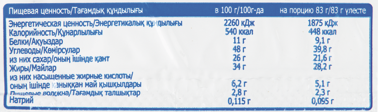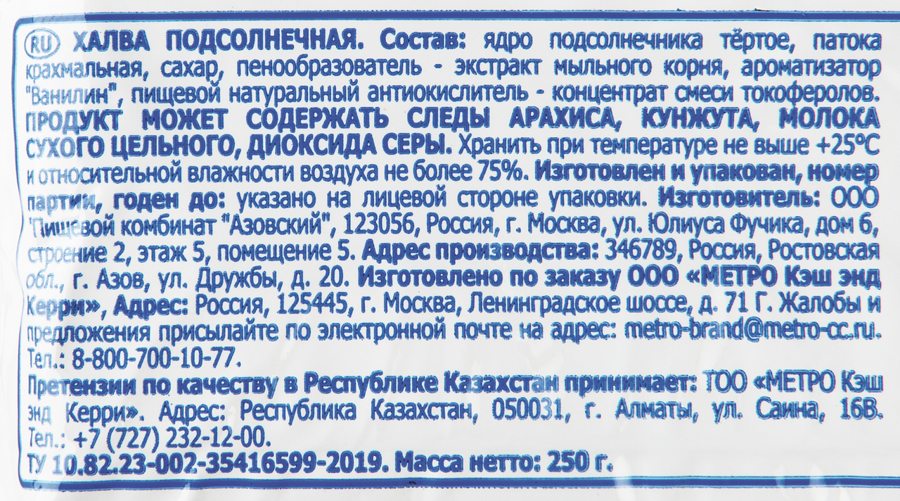 Ядро подсолнечника тертое, патока крахмальная, сахар, вода питьевая очищенная, пенообразователь-экстракт мыльного корня, ароматизатор Ванилин, пищевой натуральный антиокислитель-концентрат смеси токоферолов.