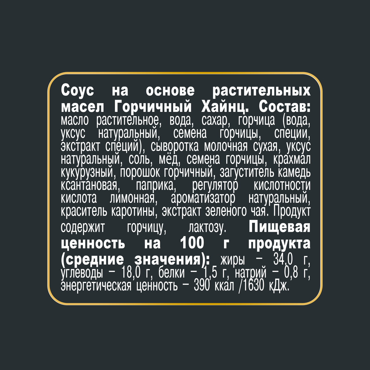 Пряно-горчичный соус, приготовленный из подсолнечного масла, натуральных желтков, семян горчицы и различных специй. Горчичный соус от Хайнц в формате дип-пот придаст вашим блюдам пикантный вкус и легкую остроту.