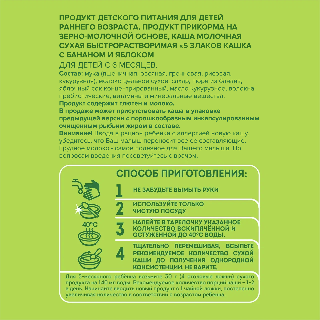 Мука пшеничная, овсяная, гречневая, рисовая, кукурузная, молоко цельное сухое, сахар, банановое пюре концентрированное, яблочный сок концентрированный, масло кукурузное, волокна пребиотические, витамины и минеральные вещества.