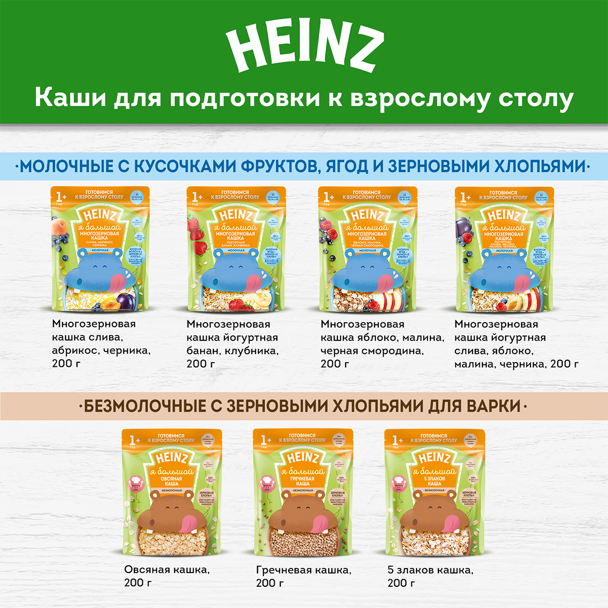 Фруктовые мультизлаковые каши Heinz с молоком имеют высокую питательную ценность, поэтому отлично подходят для прикорма детей с 6 месяцев. В составе продукции — мука из 5 злаков, обогащенная кальцием, цинком, железом и другими минералами. Молочные злаковые каши отличаются высоким содержанием растительных белков, участвующих в построении мышц детского организма и стимулирующих обменные процессы. Детские многозлаковые каши отличаются сбалансированной формулой.