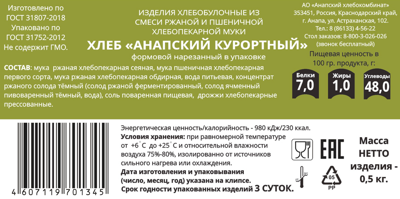 Хлеб Анапский ХК Курортный Анапский нарезка, 500г