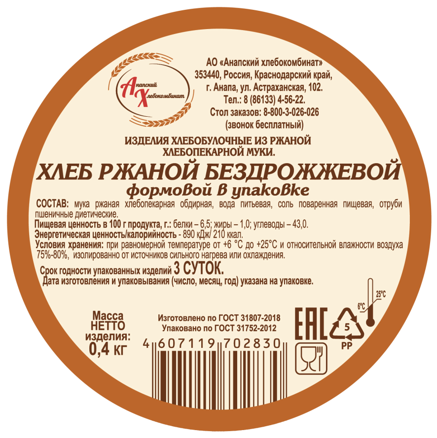 Хлеб Анапский ХК Ржаной бездрожжевой, 400г