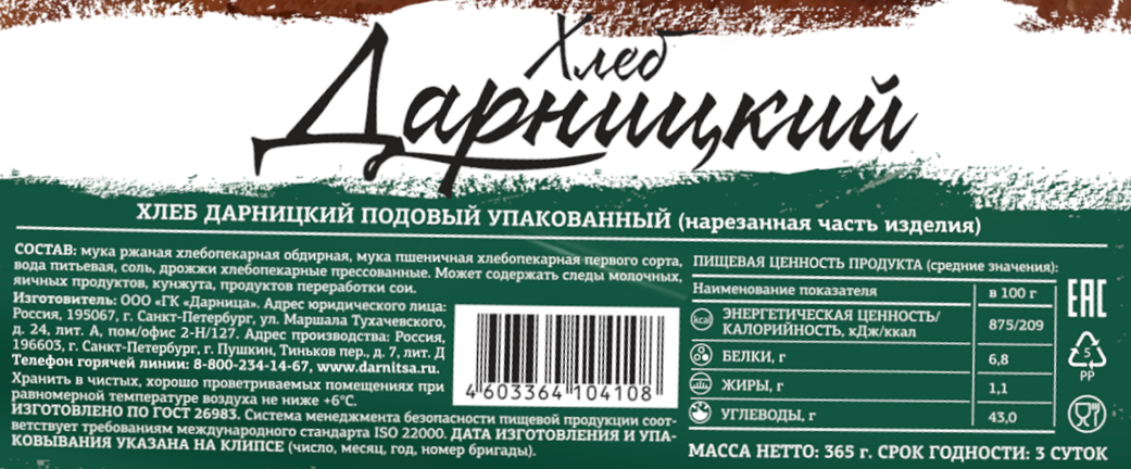 Хлеб Дарницкий - традиционный ржано-пшеничный хлеб с выраженным букетом ароматов и глубоким насыщенным вкусом, получаемым благодаря классической технологии молочнокислого брожения теста. Выпускается по ГОСТу.