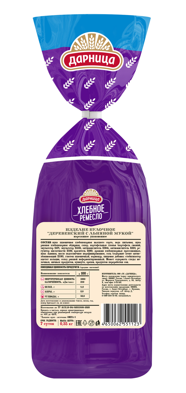 Хлеб Аладушкин Деревенский с льняной мукой, 350г – классический ржано-пшеничный продукт с тонкой хрустящей корочкой, пористым и мягким мякишем. Обладает приятным вкусом и ароматом. Продукт без крупных трещин и подрывов. Ароматный хлеб отлично сочетается с супами, мясными и рыбными блюдами, а также сливочным маслом.