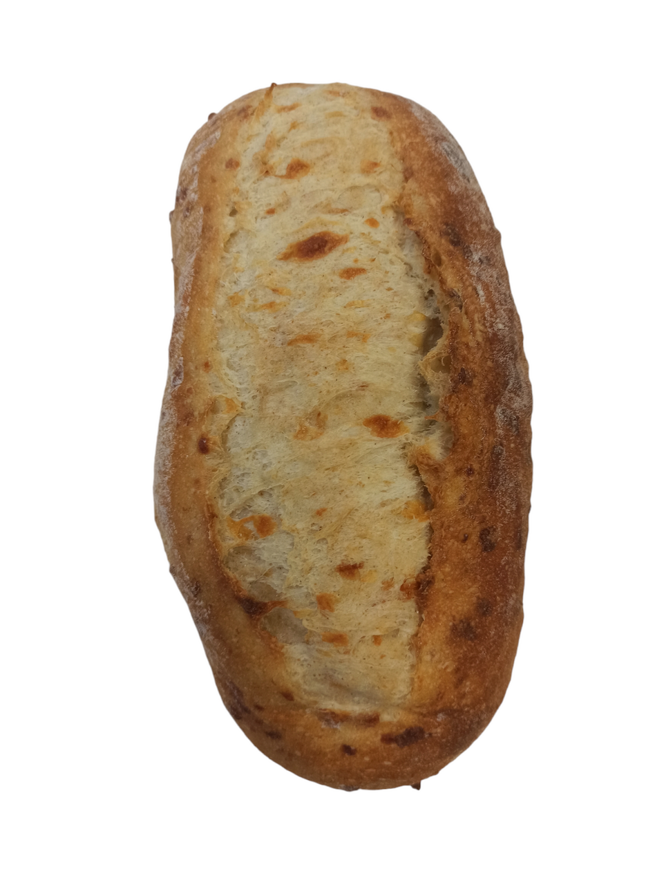 Ремесленный хлеб с хрустящей ароматной корочкой с добавлением тертого сыра и ржаной муки. Выпекается на каменном поду в соответствии с многолетними традициями с использованием специально разработанной живой закваски и применением технологии длительного брожения теста. Тепло от камня при выпечке формирует особую структуру мякиша с характерной крупной пористостью. Хлеб обладает насыщенным сырным вкусом.