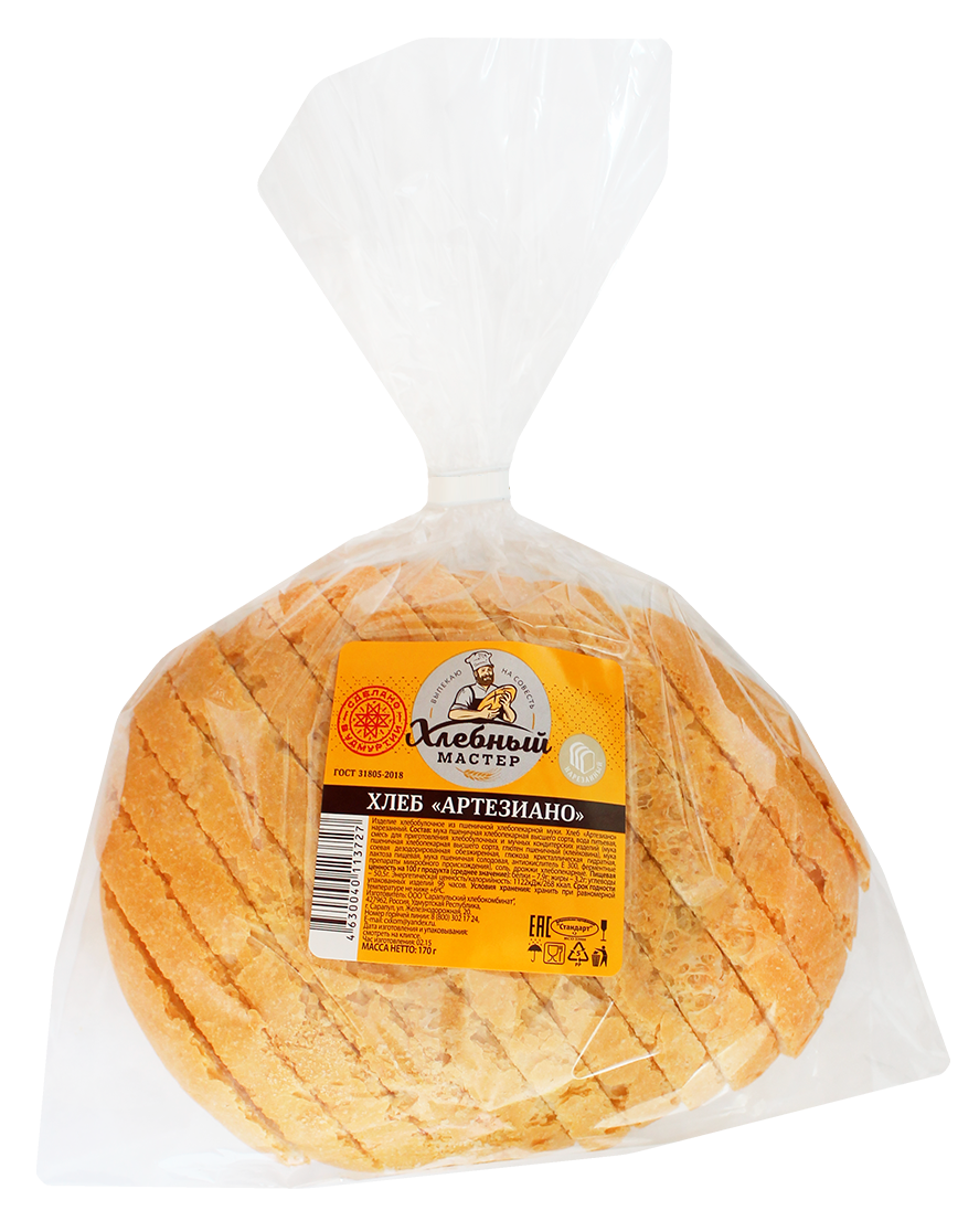 Хлеб "Артезиано" - пышный пшеничный хлеб в форме каравая с тонкой хрустящей корочкой и упругим мякишем. Хлеб продаётся в нарезке для удобства потребителя.