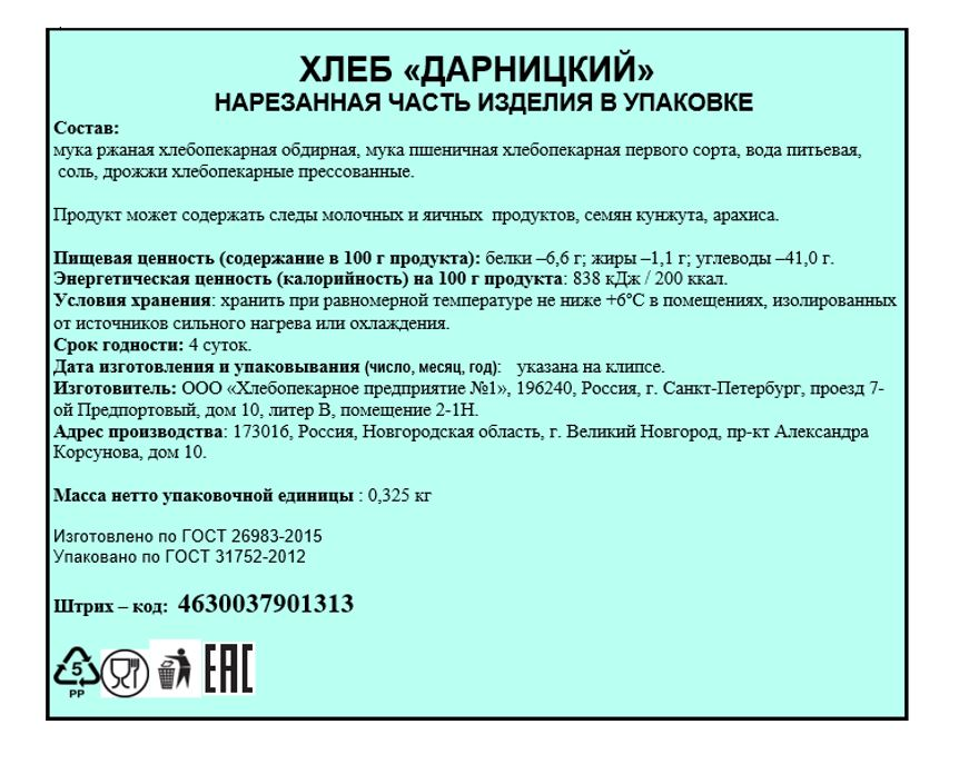 Хлеб ХПП №1 Дарницкий нарезка, 325г