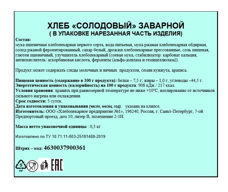 Хлеб ХПП №1 солодовый заварной нарезка, 300г