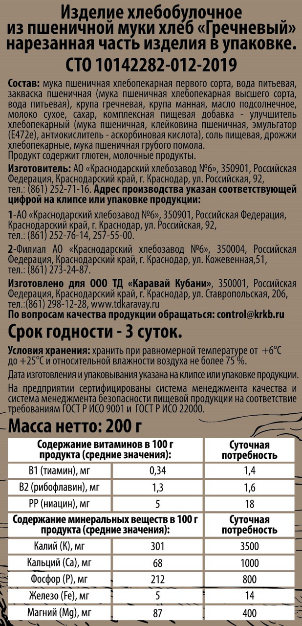 Мука пшеничная хлебопекарная первого сорта, вода питьевая, закваска пшеничная мука пшеничная хлебопекарная высшего сорта, вода питьевая, крупа гречневая, мука пшеничная хлебопекарная высшего сорта, крупа манная, масло подсолнечное, молоко сухое, сахар, комплексная пищевая добавка - улучшитель хлебопекарный мука пшеничная, клейковина пшеничная, эмульгатор Е472е, антиокислитель Е300, соль пищевая, дрожжи хлебопекарные, мука пшеничная грубого помола.
