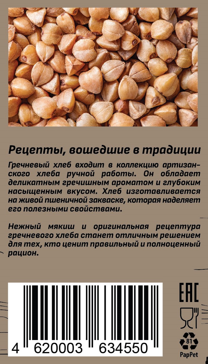 Изготавливается на живой пшеничной закваске, которая наделяет его полезными свойствами. В меру плотный мякиш и оригинальная рецептура гречневого хлеба станет отличным решением для тех, кто ценит правильный и полноценный рацион.
