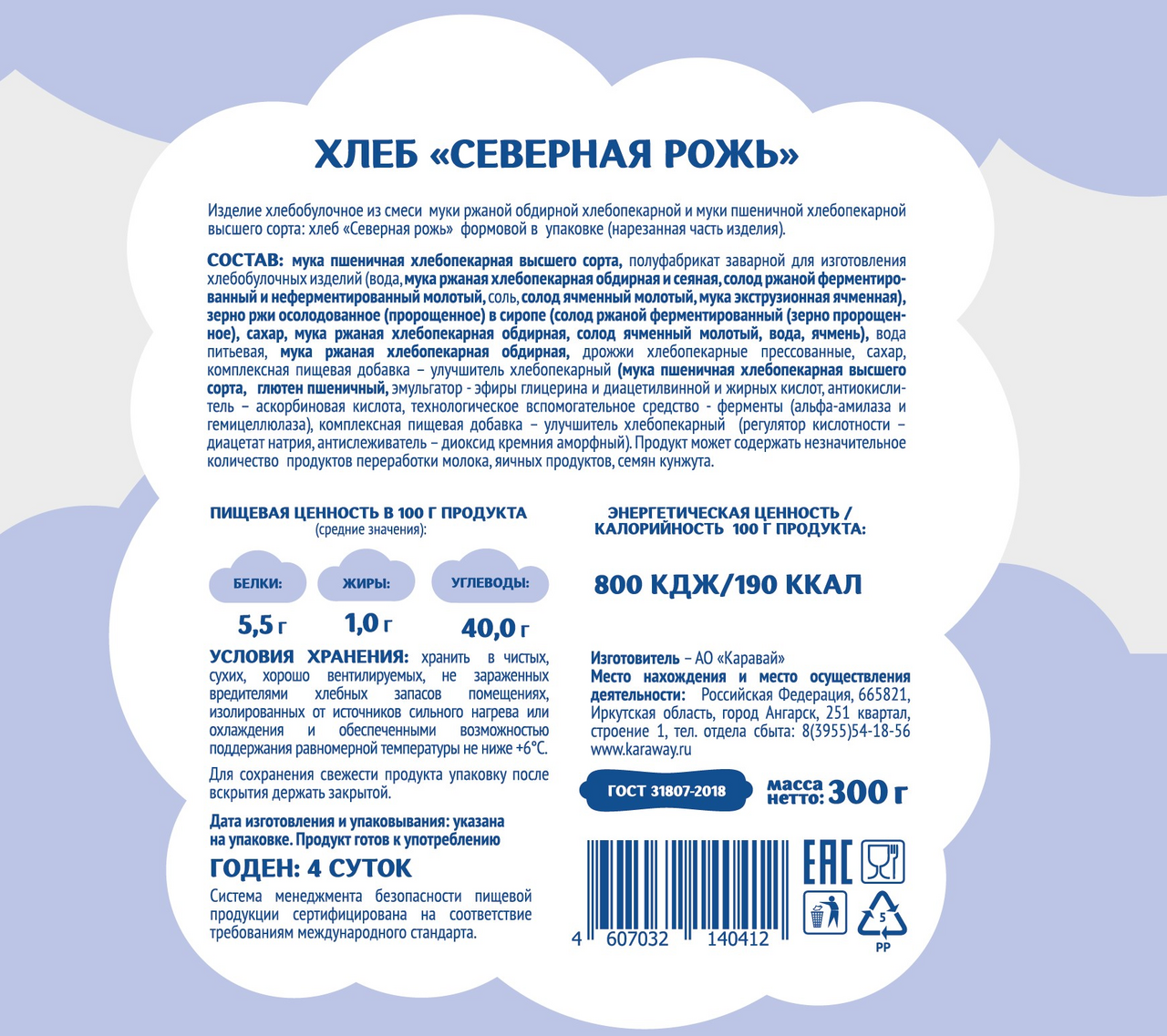 Мука пшеничная хлебопекарная высшего сорта, полуфабрикат заварной для изготовления хлебобулочных изделий вода, мука ржаная хлебопекарная обдирная и сеяная, солод ржаной ферментированный и неферментированный молотый, соль, солод ячменный молотый, мука экструзионная ячменная, зерно ржи осолодованное пророщенное в сиропе солод ржаной ферментированный зерно пророщенное, сахар, мука ржаная хлебопекарная обдирная, дрожжи хлебопекарные прессованные, сахар комплексная пищевая добавка - улучшитель хлебопекарный, мука пшеничная хлебопекарная высшего сорта, глютен пшеничный, эмульгатор - эфиры глицерина и диацетилвинной и жирных кислот, антиокислитель - аскорбиновая кислота, технологическое вспомогательное средство - ферменты альфа-амилаза и гемицеллюлоза, комплексная пищевая добавка - улучшитель хлебопекарный регулятор кислотности - диацетат натрия, антислеживатель - диоксид кремния аморфный. Продукт может содержать незначительное количество продуктов переработки молока, яичных продуктов, семян кунжута.